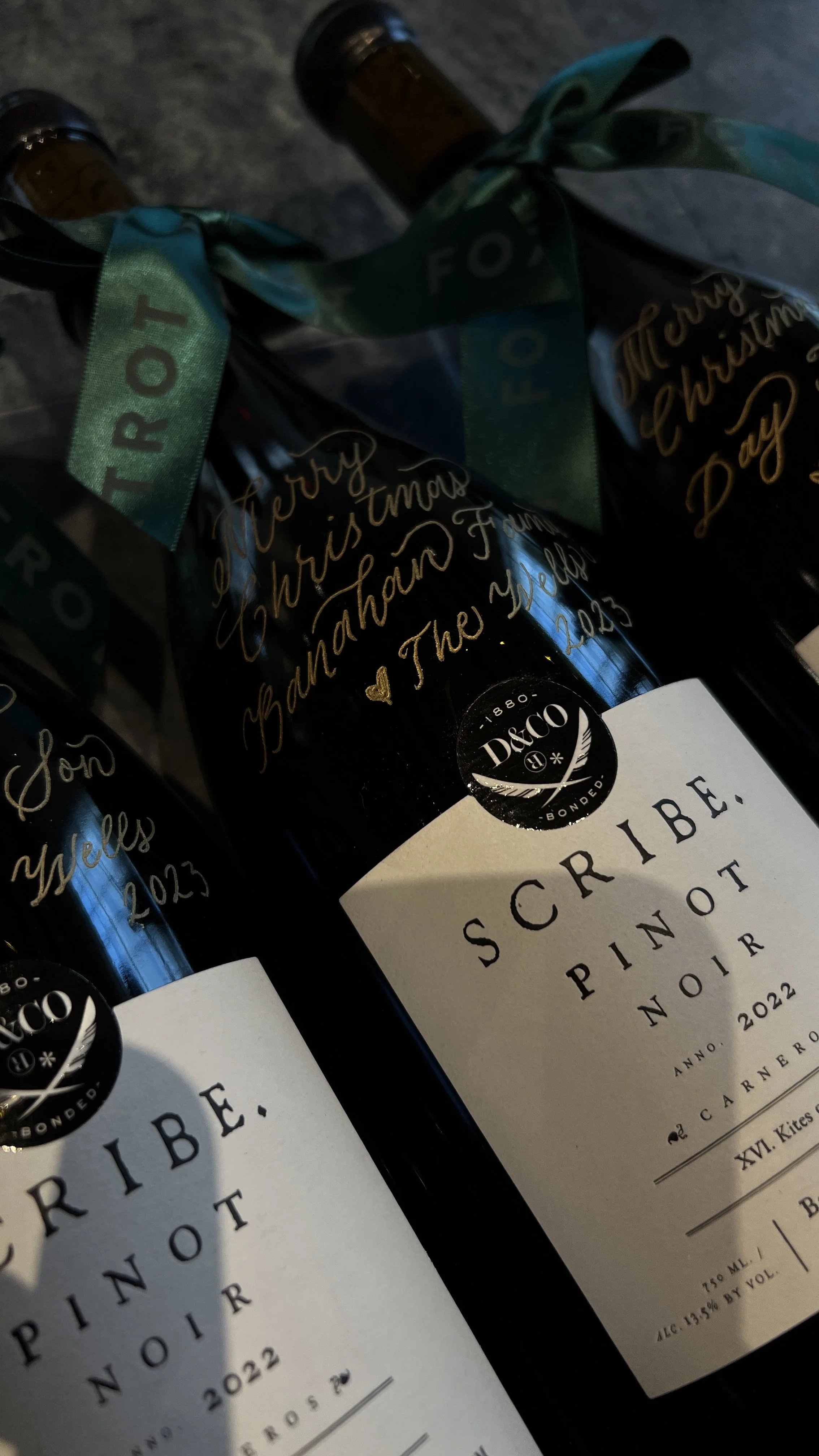 In conclusion, the calligraphy engraving event with Scribe Winery and Foxtrot Market was a celebration of art, community, and the magic that happens when creativity meets the festive spirit. Here's to the joy of crafting meaningful moments and turning each bottle into a masterpiece of holiday cheer! 🍷🎨✨