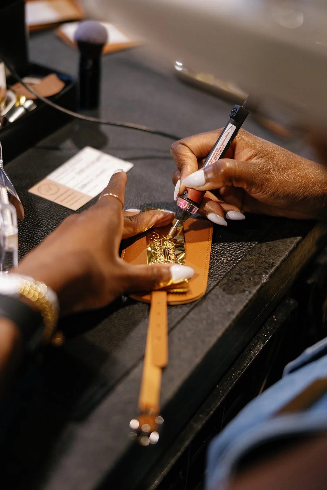 For this event, we introduced our Leather & Letters station, offering gold foil personalization on leather luggage tags and keychains. Guests were able to choose names, initials, or meaningful words and watch as each piece was finished by hand. The activation quickly became a favorite — so much so that several attendees came back for more than one item.